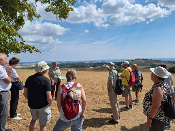 Das erste Ziel, der Ipf bei Bopfingen, wurde im Zuge einer ca. 90-minütigen Führung nicht nur erklommen, sondern das Berggipfel-Plateau auch noch vollumfänglich umrundet. Neben der frühkeltischen Geschichte, die für die Heuneburg-Ausflügler besonders interessant war, erklärte Geopark-Ries-Führerin, Martina Hahn, die Entstehung des Nördlinger Ries, die Besonderheiten des Naturschutzgebiets und die neuere Geschichte des Bopfinger-Hausbergs, dessen Anstieg von einer majestätischen Baumallee gesäumt ist.